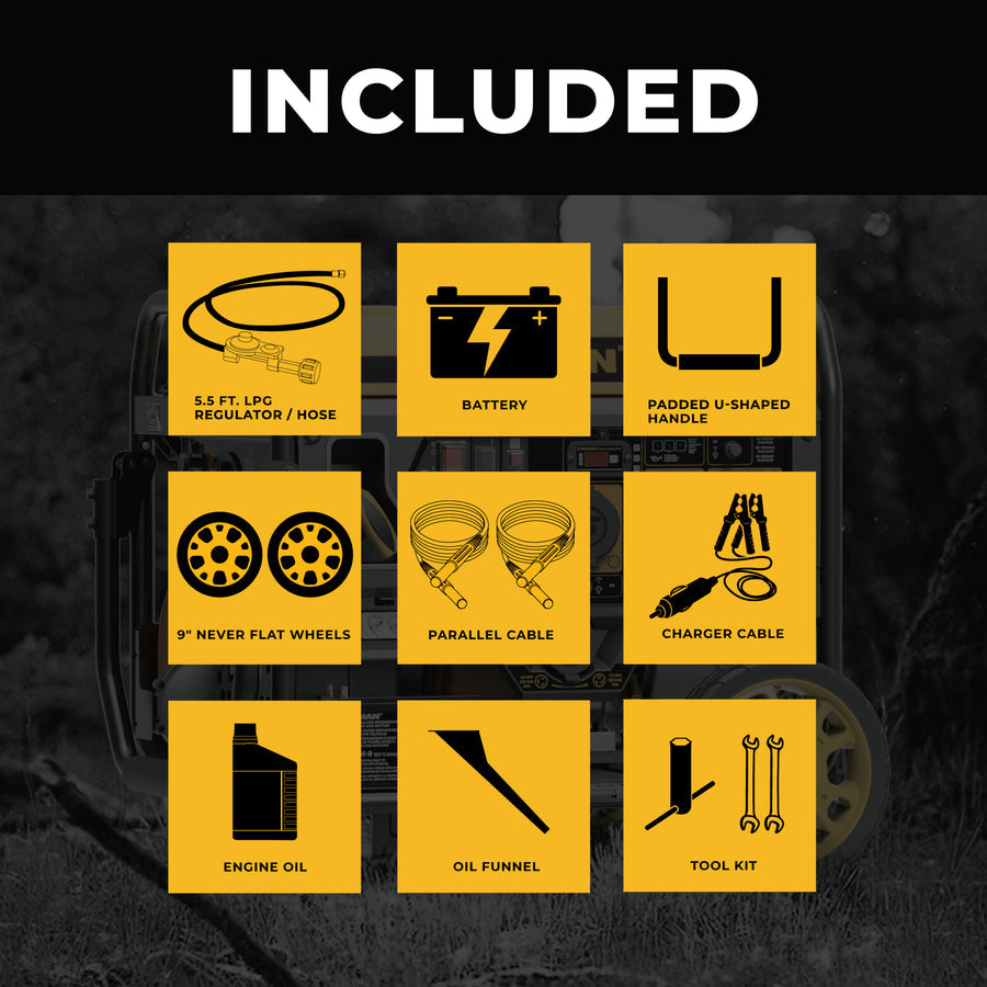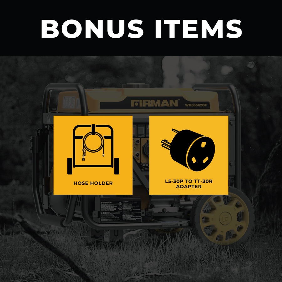 The WH03562OF comes with an engine oil bottle, oil funnel, spark plug wrench, a double open-ended wrench (10mm,12mm), 12V battery cable, LPG regulator with hose holder, L5-30P to TT-30R adaptor, parallel cable, and parallel cable holder.