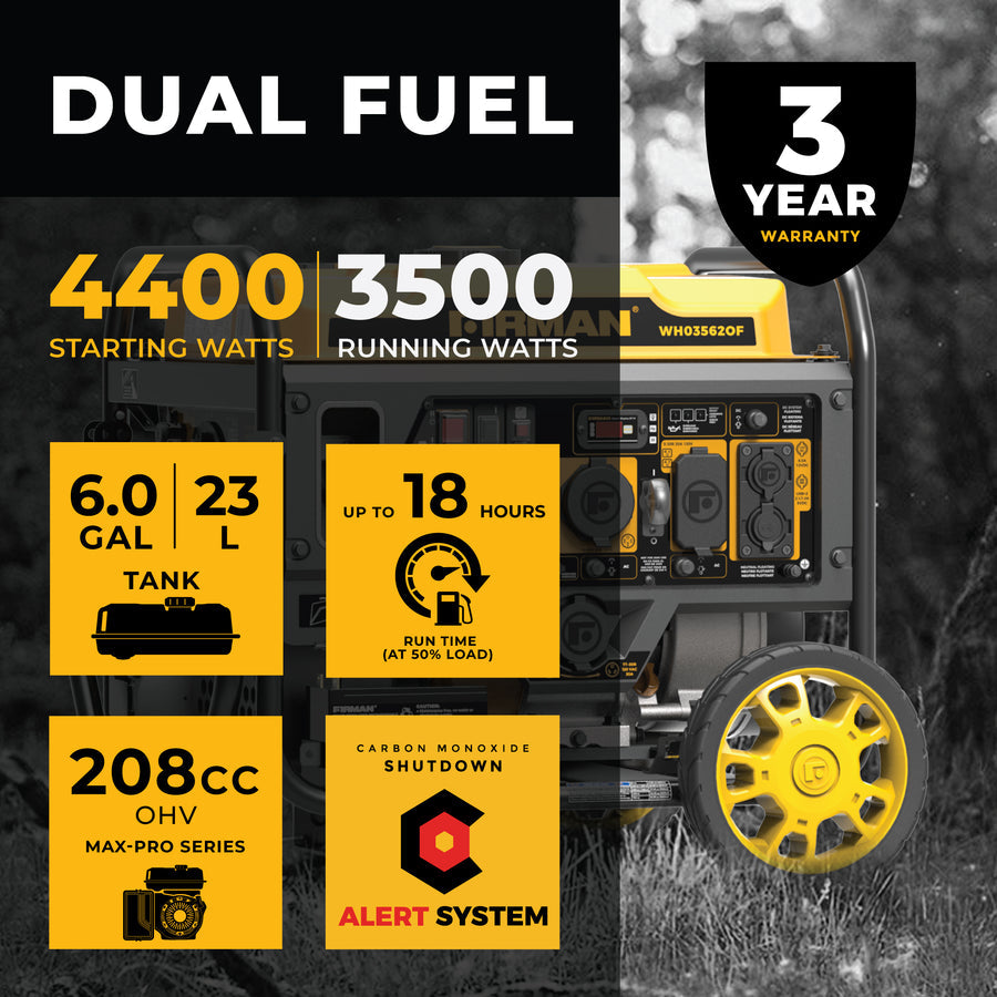 FIRMAN® Dual Fuel Open Frame Inverter 4400W Electric Start with CO Alert #WH03562OF
