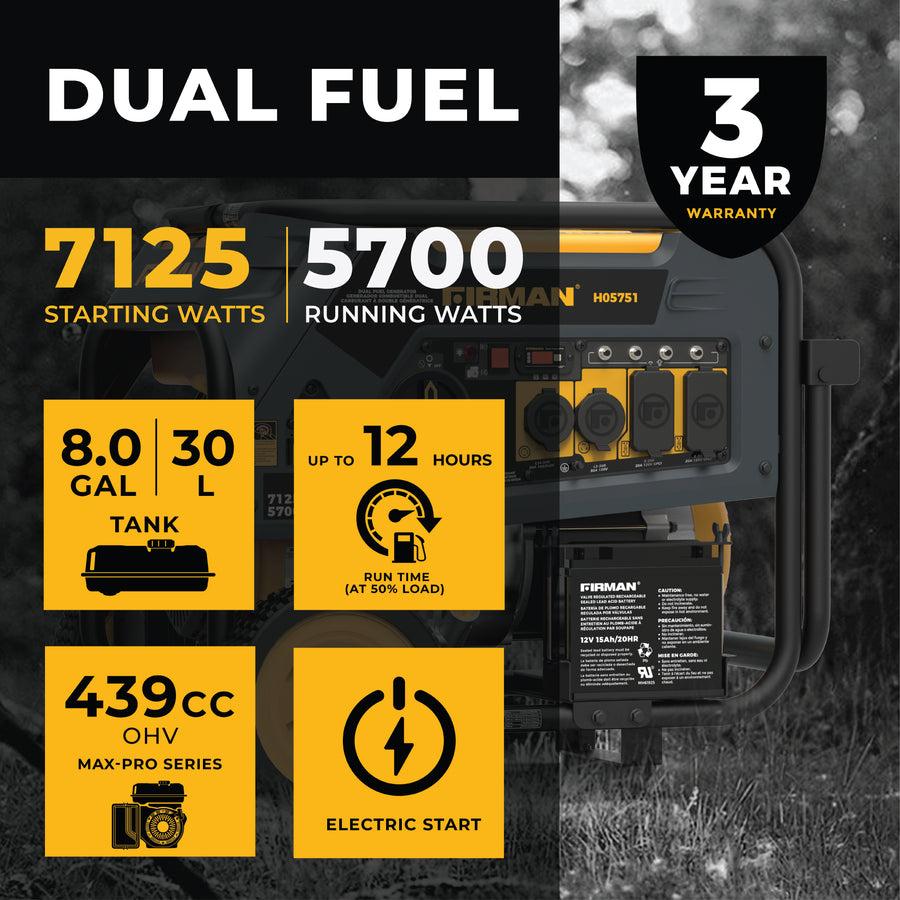 FIRMAN® Dual Fuel Portable Generator 5700W Electric Start 120/240V #H05751