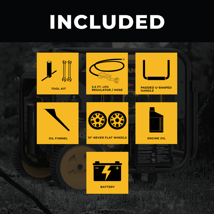 The H05751 generates 7125/5500 Watts of power. Switch between gasoline or propane at ease to suit your needs.