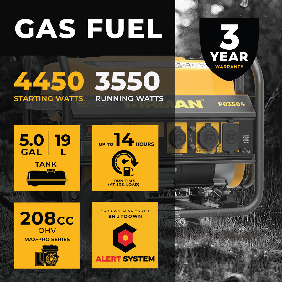 Offering 4450 Starting Watts and 3550 Running Watts and a 5 gallon gas tank, the P03504 will run for up to 14 hours at 50% load!