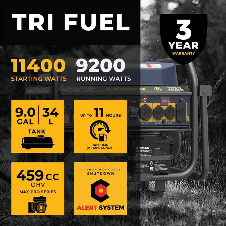 The FIRMAN T09275 Tri-Fuel generator is Revolutionary: offering up to 11400 Starting Watts/ 9200 Running Watts and running on Gasoline, Natural Gas, and Propane.